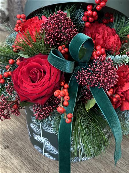 Noel this luxurious hatbox filled with red roses red carnations and luxurious Christmas foliage is a must have gift for this season. This beautiful arrangement can be delivered in Launceston and the surrounding areas. Donna has hand picked these flowers from the best seasonal availability that the markets have to offer.
