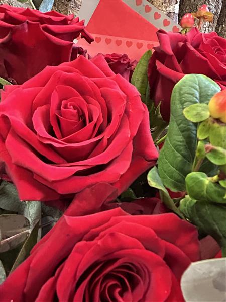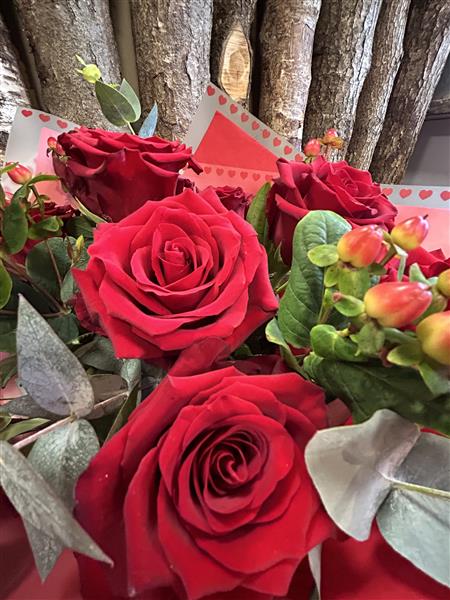 24 Luxury Red Roses hand tied bouquet using beautiful blooms hand picked by Donna from the best seasonal flowers the markets have to offer.